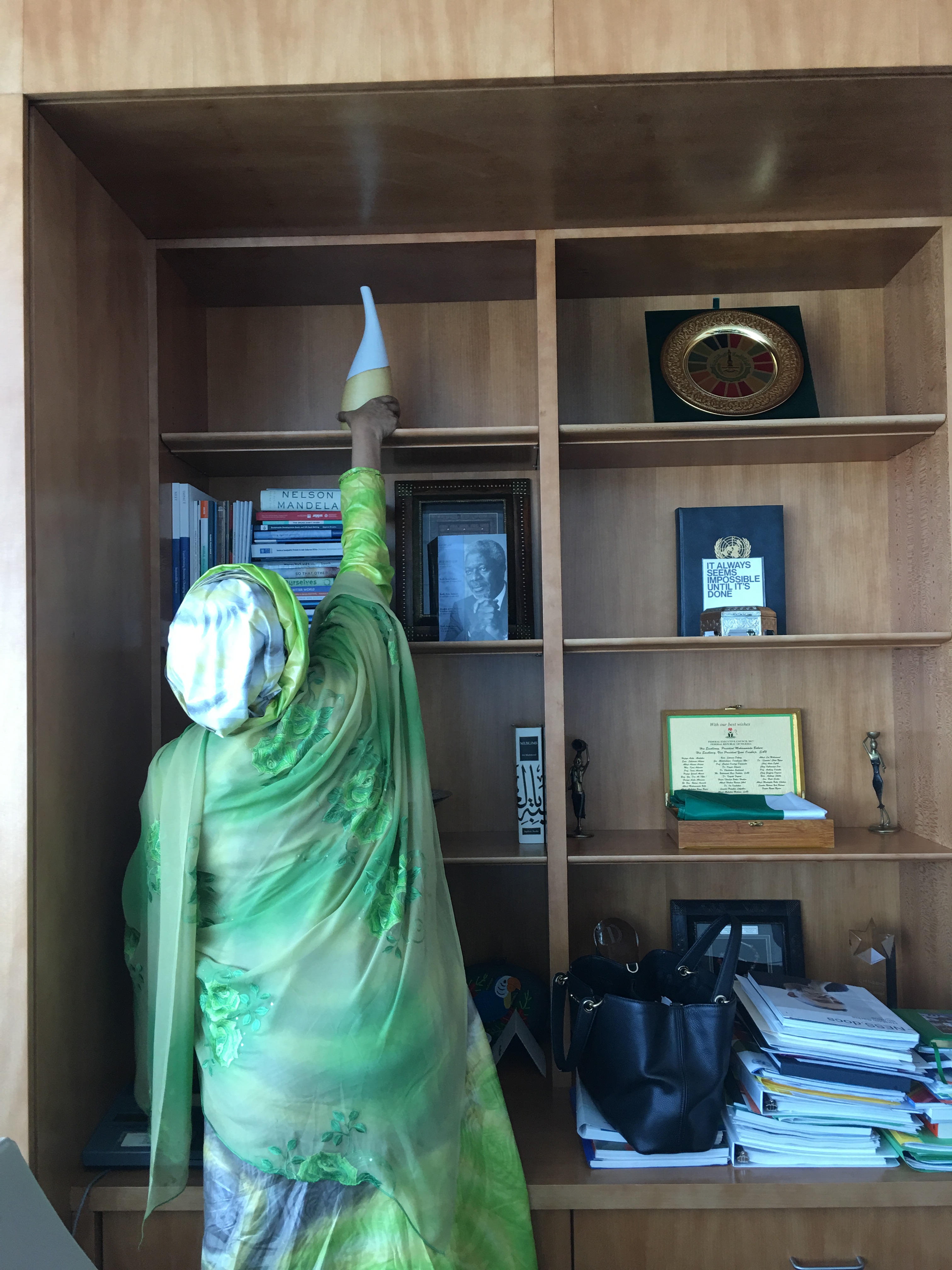I was so impressed that I asked if I could buy a similar item as a gift for UN Deputy Secretary-General, HE Amina Mohammed, whom I was planning to meet during my presence at the UN General Assembly in New York in September 2018. We had an inspiring conversation about bamboo and sustainable development, climate change, and could have taled a lot longer. When I gave her the vase, she placed it immediately on her bookshelf, where it now functions as a beacon for “bamboo as a tool for Sustainable Development”.