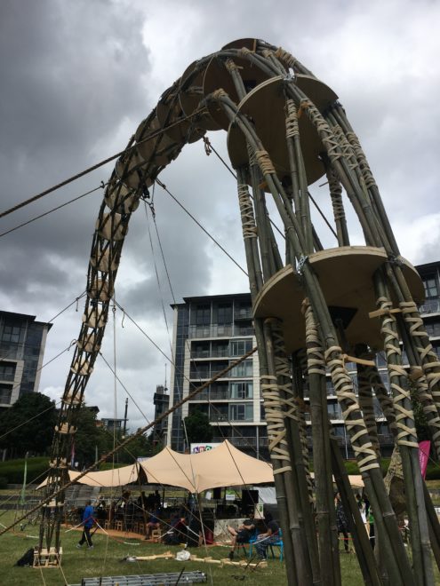 What a wonderful weekend! There were bamboo constructions made by Atelier One, ARUP and local universities; lots of opportunities to make miniature bamboo models; an explanation how to create a bamboo bicycle; performances by the NoFit State circus using props made from Borinda bamboo grown in the Jungle Giants nursery in Shropshire, music from an impromptu bamboo orchestra, a bamboo planting activity and lots of opportunities to meet new friends and old colleagues.
