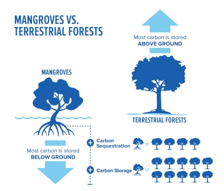 Historic rates of mangrove deforestation have created significant Greenhouse Gas emissions; since the 1950’s it has been estimated that up to 50% of the world’s mangroves have been deforested, largely due to land-use change. Halting further deforestation, and re-planting mangroves is therefore a very effective way of mitigating climate change.