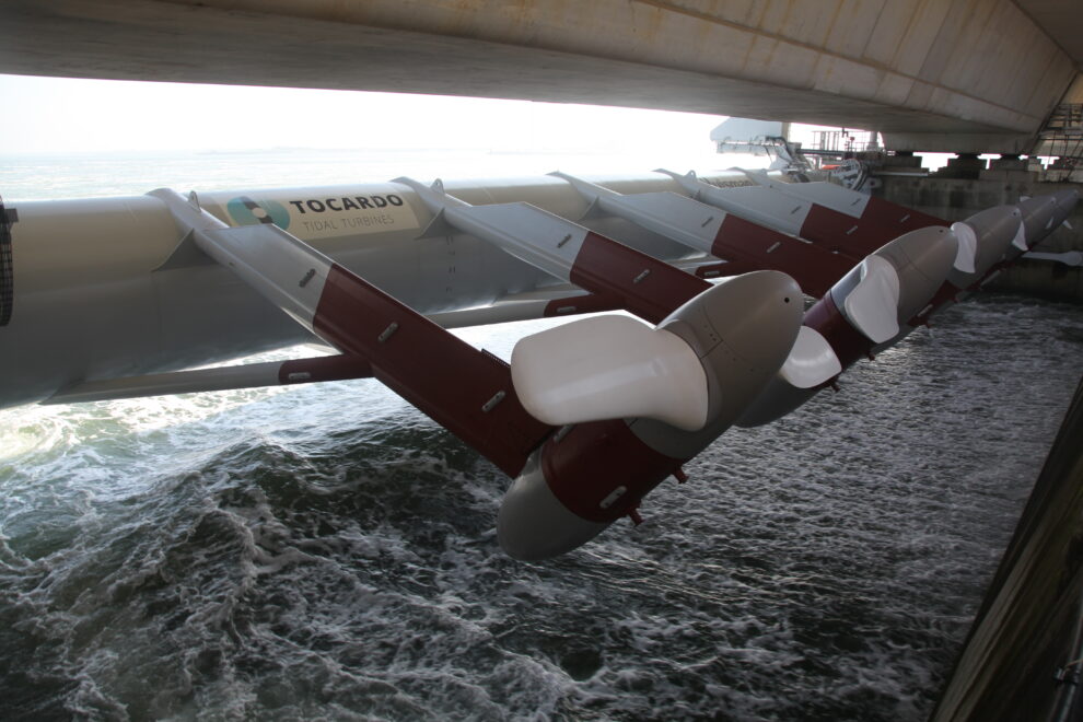 The Tidal Power Plant in the Eastern Scheldt storm surge barrier in the Netherlands (photo below) is the world’s largest commercial tidal installation of five turbines in an array.